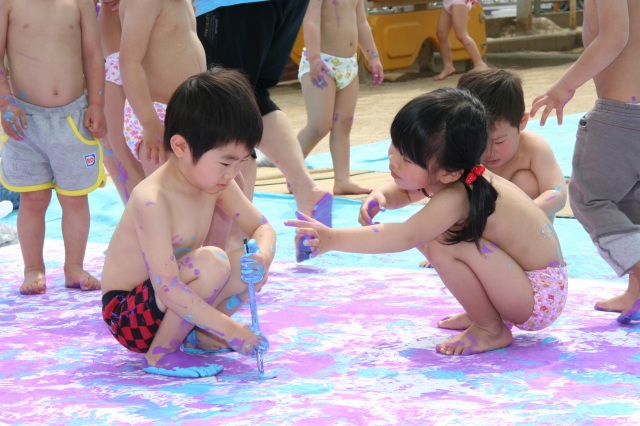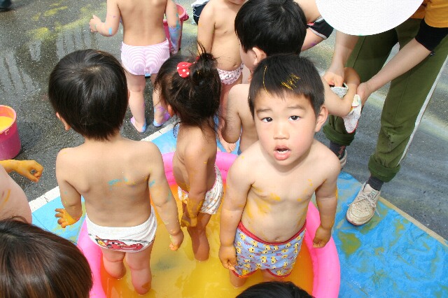 年少さんのこいのぼり製作でした。大きな紙の上をペタペタ…。絵の具に触れるのも嫌なお友だちもいましたが、ほとんどの子が意外にもはじめてなのに積極的に絵の具をたっぷりつけて塗り広げてました。小さいお手手なので、なかなか白い紙が埋まらず、足にもつけて紙のうえをお散歩していました。みんなで楽しんでクラスカラーのこいのぼりが、それぞれお部屋でどんな風に変身するのか楽しみです。いっぱい絵の具を楽しんだ後、プールで身体をゴシゴシ洗いましたが、年少さんの中には「あったか〜い」とおしりまでちゃぷんとつかり、お風呂のように温まろうとする子が続出でした。おかげでパンツまでびっしょりぬれてしまいましたが、年少さんらしいとってもかわいい姿でした。 |