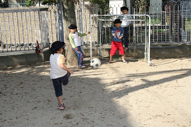 運動場でサッカーをしている子ども達を見ていました。特に年長さん年中さんがまじってしています。友達同士、上手にしているのですが、やはりルールが守れない子、ボールをとった、とってないという事でトラブルがおこってしまいます。ボールが2個しかないので、自分にまわってくる回数も少ないのが原因だと思いますが、一つ二つ増えた所でトラブルはなくなりそうにありません。みんなで元気よく遊んでいることは嬉しいのですが、最近どの子も“自分が、自分が”と思うことが多いのでもう少しお友達のことも考えて欲しいと思います。 |