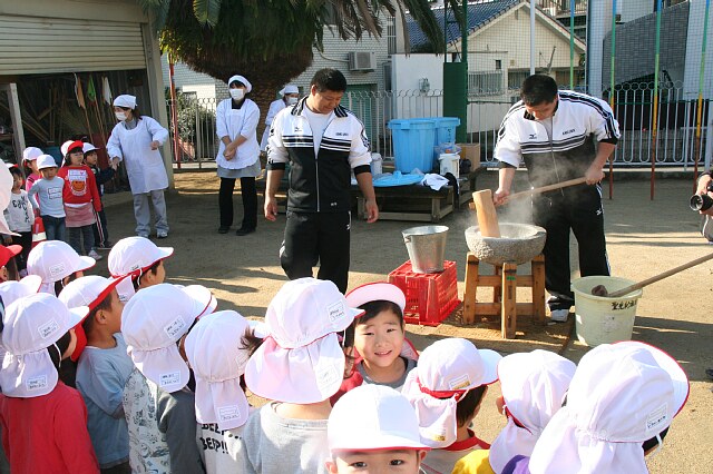 すずらんのお部屋はちょっとお得です。なぜなら、窓が運動場側にいくつかあるので、そとの様子をのぞく事ができるからです。今日はその窓に朝から子どもたちで満員状態です。かわいらしいおしりをいくつも並べながら、「あっ!あれがもち米や!」やら「おすもうさんおったぁー!」やらで、くぎ付けです。そんな様子をハヤピーはどこから感じたのか、タイミングよく内線が鳴り、「準備の様子、外に見に行ってもいいよ」とのことでした。もちろん子どもたちは「行くー!」と帽子を持って準備OKです。行く気満々になっていると、Aくんが「先生、外におる、おすもうさんって朝青龍?」とおもしろい質問をしてきたので「じゃあ、それも確かめに行こう!」と運動場に向かいました。残念ながら朝青龍ではありませんでしたが、子どもたちに見えやすいよう、おもちをついて下さったり、とてもやさしいおすもうさんでした。お米がおもちになるところまで見ることができました。一度部屋に戻って、次はみんなの番です。「ぺったんこ〜それぺったんこ〜」歌いながらつきました。そしてつきたてのやわらかいうちに食べました。おかわりの大行列がなかなか途切れず、クラス委員の方々が大活躍して下さいました。準備から後片付けまでお手伝い下さいました母の会役員・クラス委員の方々に感謝致します。また全体がスムーズに進むよう支えて下さった事務所の先生方、ありがとうございました。 |