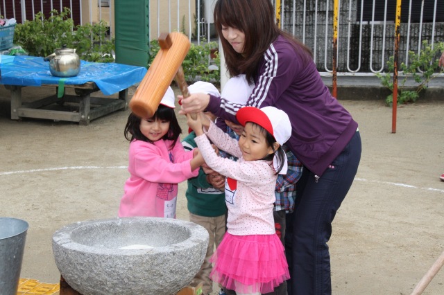 今日は雨が心配でしたが、朝起きてみると雨は止んでました。地面は少しぬかるんでましたが、おもちつきは充分できる状態でした。多くのお母様お父様に準備を手伝ってもらいました。私はカマドの火をおこしたり、カマの水の番をしてる間に、少し餅つきもさせてもらいました。それにしてもおもちつきのときの、子どもたちの喜び具合が絶大でした。普段あまり触れることのないことなので、大きな歓声が園に響いてました。 |