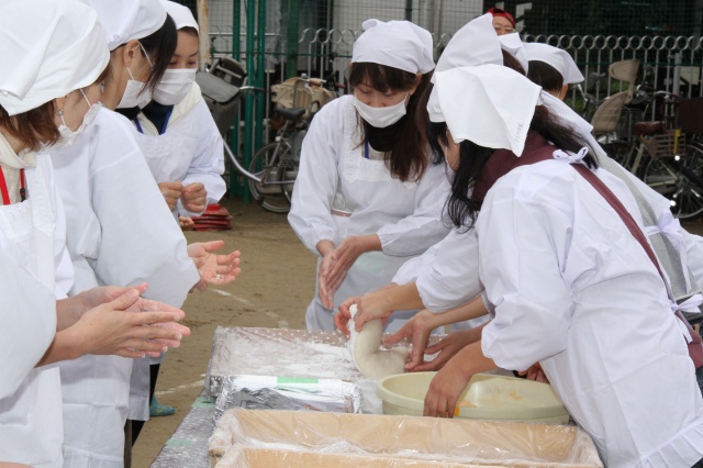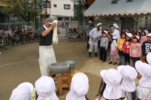 心配していた雨もどこかへ行き、もちつきができました。役員さんの準備にはじまり、学級委員さんお手伝いに来て下さった方の力なくしては、このおいしい「おもち」はありません。元母の会の方々の手際よい片付け、力強い近大すもう部の学生さん、理事長はじめ職員誰が抜けてもできなかったと思っています。お部屋では誰一人おもちをのどに詰まらせることもなく、おかわりの嵐だったようです。今どき薪をくべ、もち米を蒸すところから、おもちをつくのは日本の文化を継承していくことだと思います。大きくなった時に子どもたちはわかるでしょう。おいしいおもちができました。また、今回初参加の林