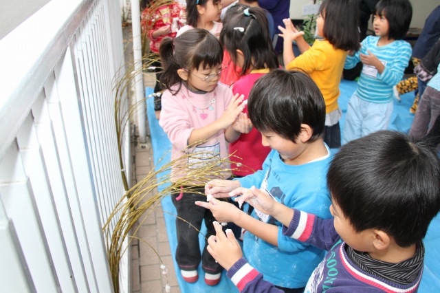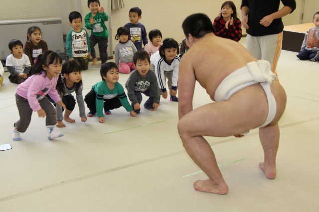 今日は、みんなが楽しみにしていたおもちつきの日でした。昨日、洗って水に漬けておいたもち米と、何もしていないもち米の2つを置いて、どう変わるのかにんなで見てみる事にしました。朝来たお友だちは、早速もち米をチェックして、「お水に入ってるのが大きくなった〜!」食べる用意をして、いざおもちつき開始です!最初はお手伝いに来て下さった、おじいちゃんやおすもうさんにお手本を見せてもらい、みんなその様子を食い入るようにじ〜っと見つめていました。そして、4人ずつで杵を持ち、ぺったんこぺったんこと、頑張っておもちをついていました。杵におもちがくっつくと、引き上げるのに一苦労でしたが、「わぁ〜くっついた〜!」と子どもたちは、それもまた楽しんでいました。お部屋に戻り、おもちを黙々と食べるみんな…。その食いっぷりはいつもに増してすごかったです。自分たちでついたおもちは、出来立てでやわらかくて、びよ〜んと伸びるのが気にいったようで、野菜の入ったお雑煮もペロリと食べている子がほとんどでした。おもちをたくさん食べてパワー全開になった後は、昨日から練習して楽しみにしていたおすもうごっこ!特に男の子は大きなおすもうさん相手に果敢に挑んでいました。おすもうさんに勝った時は、みんな大喜びでした。最後になりましたが、今日のおもちつきを無事に終えられて楽しく過ごせましたのも、母の会やクラス委員の方々、お手伝い下さった方々など、多くのご協力あっての事と心より感謝致します。ありがとうございました。 |