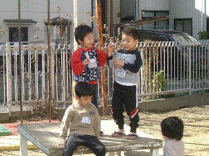 今日の朝、起きてから窓の外を見ると、町中がうっすらと一面雪景色になっていました。子ども達も登園してくるなり「今日な、雪つもってんねん。」「車の上の雪、触った。」などと、雪の話で盛り上がっていました。そして運動場が開くと、「わぁ〜雪や!雪ある〜。」と言いながら、寒さにも負けず、必死で雪を集めて遊んでいました。「ホラ見て!こんなにも雪集まった!」「見て見てー。氷あった」とビニール袋に集めていました。しかし園庭には、あまりたくさんなかったので、あっという間になくなってしまいましたが、修平先生が近くに駐車してある車の上の雪を集めてきてくれました。そして、その雪で雪だるまを作り、子ども達が石や枝、コップ等で顔や手を付けてあげました。そのかわいい雪だるまは、朝礼台の上で2つ並んで置いています。いつまで溶けずに残っているかわかりませんが、今日も明日も寒い日になるようなので、しばらくは朝礼台の上から子ども達の様子をじっと見ていてくれることでしょう。今年初めての雪に、子ども達も大喜びでした。 |