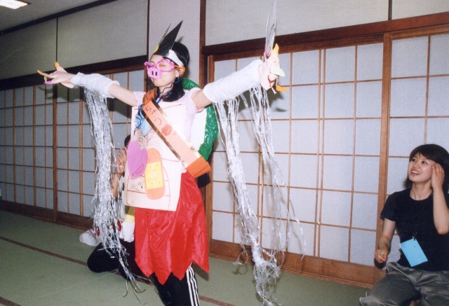 今日は、どきどきわくわくのお泊り保育の日です。ニコニコ顔で「おはよ〜」と部屋に入ってくる子もいれば、不安な表情を浮かべて入ってくる子もいました。そんな子ども達もあやめ池遊園地の乗り物に乗る頃には、目がキラキラと輝き笑顔でいっぱいでした。運良くドラえもんに会う事も出来ました。グーしか出せないドラえもんとジャンケンをしたのですが、ジャンケンポィ!と出した子ども達の手を見てみるとグーやチョキを出している子が…。素直な子ども達の気持ちをかわいらしく思いました。雨が降っていましたが、昼からはドラえもん館でしたので、雨の心配もせず、ゆっくり見る事が出来ました。思いっきり遊んだ遊園地を離れ、高円山ホテルへ。みんなで入ったおフロは、泳いだり水をかけたり、まるでプール遊びのようです。残念ながら雨のためキャンプファイヤーは出来ませんでしたが、歌をうたったり、子ども達が私に服や飾りを付けてくれるファッションショーがあったり、先生達の劇を見たり、笑い声が絶えませんでした。一杯遊んだひまわり組の子ども達、少しさみしくて眠れない子もいましたが、ほとんどの子どもはぐっすり。あっちへコロコロ、こっちへコロコロしながらもよく眠っていました。私も子ども達と同じ初めてのおとまり保育、すごくいい思い出となったと思います。