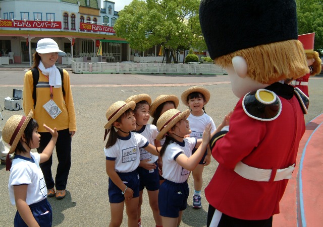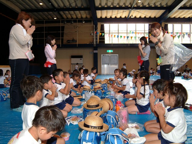 今日は子ども達が待ちに待ったハイキングでした。登園して「おはよう」の前に「今日ハイキングやんな!」とはりきる子ども達、ホイル弁当の中身クイズをしてきたり、とても嬉しそうです。バスの中でもウキウキした気分で、「お山が近づいてきたよ」と言っただけで「イエ〜イ」と言ったり、とてもテンションは高かったものの、「お話するよ」と言ったらほとんどの子がちゃんと聞いていたので、さすがだなとい思います。公園でも、元気に楽しくすべり台や芝すべり、虫をさがしたり、子ども達はたくさん遊んでいました。でも、とても暑かったのでお茶を飲みにいっては遊びのくり返しでした。お弁当を食べるところは木蔭で涼しかったので良かったです。付き添いの役員の方々には、毎回たくさんお手伝いしていただき、本当に感謝しております。ハイキングでは、お約束を守りながら楽しく遊べた子ども達ですが幼稚園に戻ってから、少し変なテンションになってしまい、落ち着きもなくなってしまっていました。せっかく楽しいハイキングの後でしたが、やっぱりほったらかしにするわけにもいかないので、みんなで考えてみました。でも今日のハイキングの話をして、ニコニコして「楽しかった!」と言っている子ども達と、「お約束守れたら、ケガもないし楽しいよね」と声をかけると「ウン、そうなや」と言ってくれました。子ども達をおさえこんでしまったりしないように、考えながら言葉をかけていきたいなと思います。 |