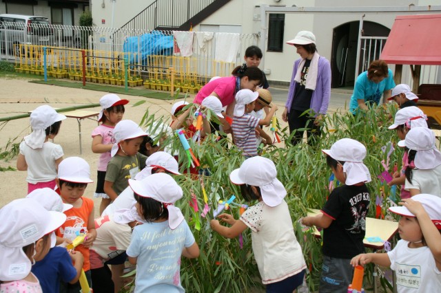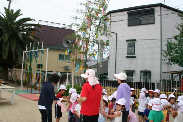 今日は七夕かざりのタコとイカに顔を描き、足をくるくると巻きました。足をくるくるさせると本当に動きが出てかわいくなりました。みんなでびょんびょんと動かし、同じように「タコおどり〜!」と自分たちもタコさんになってみました。子どもたちは「えー!」と言いながらも「タコおどり〜!」と言うとちゃんとタコみたいに動いているのがおかしかったです。 |
