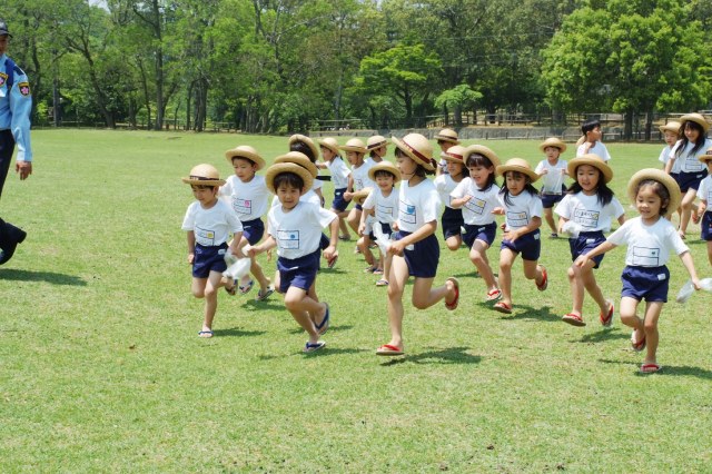 みんなが楽しみにしていた山本公園散歩。暑すぎず、寒くもなく本当に過ごしやすいてんきでした。山本公園まで大人の足でならあっという間ですが、初めて園外を歩くみんなにとっては長い道のり。隣の友だちと手をつなぎ、まっすぐ歩く…と言うのが難しいのです。ちゃんとたどり着くのか心配でしたが、ミサトッコが脱げながらもなんとか予定していた時間よりも早く到着しました。公園では、すでに北山本幼稚園のお友だちが遊んでいて大混雑。大人気の総合遊具は長い列が出来ていました。自分だけ先にすべりたいと割り込みしようとする子が何人かいましたが、「順番だから遊ぼうね}と声を掛けると最後尾に行き、ちゃんと待っていました。砂遊びを楽しむ子も多く、みんな楽しんでくれていたと思います。帰り道はちょっと疲れが出たのか何度か止まって列を修復しなければなりませんでしたが、初めてのお散歩にしてはみんなしっかり歩いてくれました。付き添いで下さった役員さんのおかげで楽しくケガなく過ごすことができました。ありがとうございました。 |