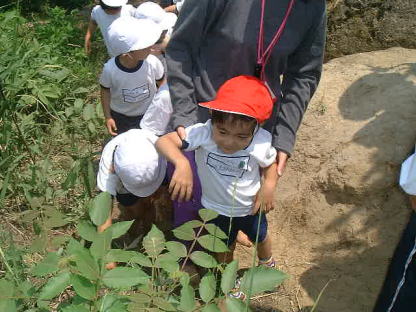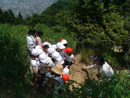 今日は、こすもす組さんと信貴山ケーブルに乗って、ハイキングに行って来ました。今日も30℃を越える真夏日で、とても暑かったです。子ども達は初めてケーブルに乗る子がほとんどの様でした。出発してどんどん高く登っていくと、窓の外には小さくなった八尾の街並が、目の前に広がり子ども達はそれをみて、「わぁ〜すごい」と少し興奮気味でした。途中でケーブルカーとすれ違ったり、トンネルに入ると、パチパチパチと拍手して大喜びでした。そして、ケーブルを降りてすぐ目の前にある崖を登って遊びました。まずは、私と金原先生とで登って見せました。子ども達は下から「ガンバレ、ガンバレ」と応援してくれました。それから年中さんから順番に崖登りにチャレンジ。今年の子ども達は、みんなパワフルで誰一人恐がらずに、楽しんで登っていました。上まで登って降りてくる時は、おしりでズル〜ッズル〜ッとすべり台。みんな何度も繰り返して、登っては降り登っては降りて楽しんでいました。おかげでおしりは砂だらけ…。おしりだけじゃなくパンツも砂でドロドロの子もたくさんいましたが、それだけ何度も崖登りを楽しんだ証拠です。部屋に帰ってきてからも積み木を並べて、その上に並んですわり「ケーブルカーに乗ってんねん、いってきま〜す」と遊んでいました。みんなケーブルカーがとても気に入ったようです。また機会があれば、お家の人とも一緒に行って欲しいと思います。 |