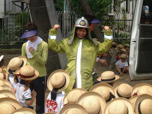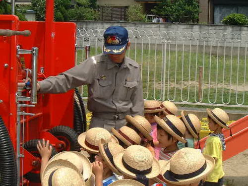 10時すぎに非常ベルが鳴り、子ども達はお手ふきタオルで口と鼻を押さえて運動場に避難し、訓練は始まりました。運動場に無事みんな集まり、消防士のおじさんから火事や防火についてのお話があった後、実際に薪に火をつけて水の出る消火器で消火する様子を子ども達に見てもらいました。その後年長さんはホールで防火のビデオを見て、年中・少さんは消防車を見せてもらいました。消防士さんが本物の防火服を着て見せて下さったり、少しだけサイレンを鳴らして下さったり…と、例年以上にゆっくりと説明しながら消防車を見ることができました。 |