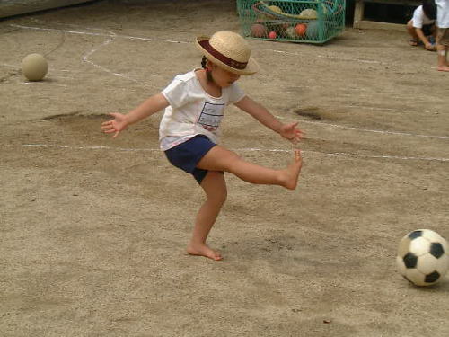 今日はとてもいい天気で、外に遊びにくる子達でいっぱいの運動場。サッカーやなわとび、泥あそびなど楽しんでいます。「先生〜今な、サッカーしてるねん」AくんとBくんはボールを足で押さえてキックをして遊んでいました。するとゴールの近くにちいさい組さんが、やってきました。ゴールの中に入って一緒に遊ぼうと思ったみたいで、うろうろしながら、ゴールの前を行ったりきたり…。キックをしようと思ったBくんは「そこ、どいて!」と大声で言いました。ちいさい組さんは、何がどうなのか分からない様子です。サッカーで遊びたい子達も、次々に通り過ぎる子達に「あぶない」「どいて」を続けて言ってます。「教えてあげるんだったら、もう少しやさしく言わないとね」と声を掛けると“あっ!”と思ったのか、急に体が小さくなってしまった様子です。きっとかっこいいお兄ちゃん達の遊びを見て、入れて欲しいという気持ちを持ったのかなと思いました。少しずつ園に慣れて、一緒に遊びたい気持ちが出てきた年中・少さん。そんなお友達を見て、それぞれの思いを伝える年長さん。今はまだ時にやさしく、時に強く(?)ですが、これから仲良しになってくれるかな…と思います。まだまだ不器用な(?)子ども達の気持ちを見守りたいと思います。 |
