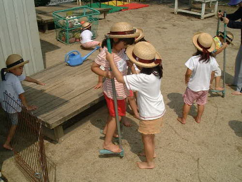 今日はお部屋でおもちゃ体操をしてみました。5・4・3・2・1・0とロケットで始まるのでおもしろかったようです。楽しくノリノリでできるように、私もかなりのオーバーリアクションでしてみると、すごくなりきってしてくれました。なかなか、みんなこの体操が気に入ったようで「もう1回もう1回!」とアンコールの嵐で、3回も続けてしていまいました。私にとって3回連続はちょっぴりきついものがありましたが、1回終わるたびに楽しくて仕方がないという子ども達を見ていると、素敵な汗をかいたなぁと思いました。 |