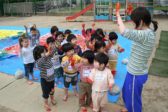 花冷えの中での年少さんのこいのぼり製作でした。服を着たまま絵の具を手足につけていたので、全身絵の具まみれの子はいませんでした。足を洗うのにビニールプールを用意していたのですが、絵の具のお湯の中で泳ごうとする子がいてあわてて起こしました。バケツで手を洗っているとバケツの中につかってしまう子もいて3才児の素直さがとてもかわいく思えました。年長さんになる頃にはこいのぼり製作の意味もわかり、しっかりしてくるかなと思うと楽しみです。 |