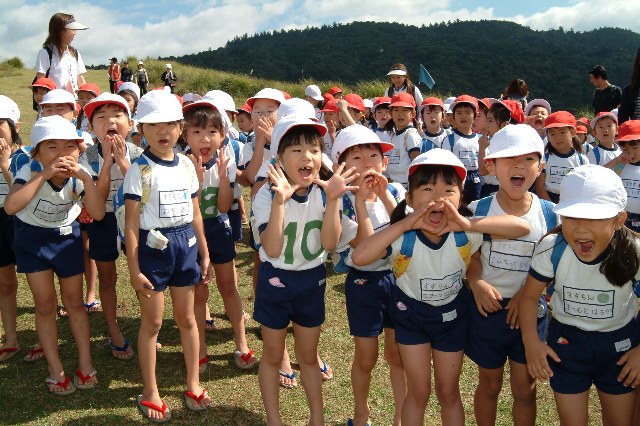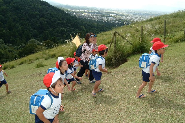 今日は良いお天気の中、若草山へ行きました。朝はとても涼しかったのですが、頂上で寒がる事なく過ごせました。若草山の入口で大きな山を見て、みんなは「あそこまで行くの?」と私に聞いてきました。「ううん!もっと上だよ」と言うと「え〜〜!!」とびっくりしていました。途中の急な斜面にも驚いていましたが、でもやったるぞ!とわくわくする気持ちもでできた子ども達。私を抜かすいきおいで登っていました。登りきると少し疲れた様子でしたが、目の前に広がる町を見て大喜び。そして上からあやめぐみとゆりぐみの「ヤッホ〜」がきこえてきました。あの頂上まで行くよと伝えると「まだ……」と少し顔を曇らせていました。空は秋晴れできれいな青空で「もっと空の近くまで行けるからがんばろう!」と声をかけると「よしっ!」と少しまた頑張る気持ちを持ってくれました。本当に空が近くAくんが「あの雲、綿菓子みたいやな、食べれそうやな」と一言。「本当、手がとどきそう」などとお話しながら最後は登りました。山の上から大仏殿やドリームランドも見え、子ども達は大喜びしてました。ごはんを食べてからはバッタなどの虫さがしや、すすきを見たりとみんな楽しく過ごしていました。草むらの中からは虫の鳴き声が聞こえてきて、これは何だろう?と虫の声の歌を思い出しながら、耳をすませました。今日は秋をとても感じられる素敵な一日となりました。ご協力頂いた皆様方ありがとうございました。