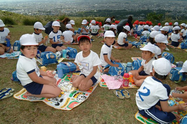 今日は若草山への遠足です。素晴らしいお天気になり年少の子ども達と幼稚園バスに乗り出発しました。高速に入りトンネルがあると服や顔の色が少し変わるのでそのたびに「キャー!」という声があがりました。今年の春は親子遠足で動物園に行ったので奈良は初めてです。近づいてくると「あ!しかや」と鹿さんを見つけ声をあげていました。10時くらいに若草山に入ったのでまだ遠足の子ども達は少なく、あまりにも大きな緑の山に「ウワーひろい!」と子ども達もビックリです。ドングリを拾ったり若草山に少しだけ登ったりして約1時間ゆっくりと遊びました。走って降りてくるのは危ないのでゆっくり歩いてきたり、また寝転がってコロコロと降りてきたりとそれぞれに楽しんでいました。初め“しかのうんこ”が気になっていましたが、遊び始めると大丈夫でした。お弁当を食べる前にはしかさんが近くまで来てくれて、そーっと触ったりして仲良くしていました。年長、年中さんは上まで登っていくのですが、年少さんはお弁当、おやつを食べ、ゆったりと遊んで帰ってくる事ができました。お手伝い下さった保護者の皆様ありがとうございました。また一つ楽しい経験ができた事と思います。 |