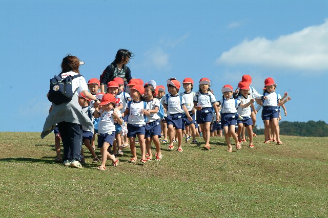 青空が広がる秋晴れの中、若草山に行く事ができました。今までハイキングの時に幼稚園バスに乗って行っていますが、奈良までの長い距離は初めてです。大丈夫かな?と少し心配しましたが、いつもの元気で楽しく奈良まで行くことが出来ました。若草山の入口では鹿がいっぱいで、子ども達は「鹿さ〜ん、鹿さ〜ん」と大喜びでした。若草山に入ってからは、目の前に広がるきれいな緑の山にびっくりしていました。昨日から絵本を見て「ドングリひろいをしようね!」と言っていたので、さっそくビニール袋を持ってドングリひろいに行きました。最初は土の色と重なって、ドングリを見つけられなかった子ども達ですが「ドングリのぼうしを見つけてごらん!」と声をかけると「見つけた!」「あった!」と次から次へ上手に見つけ始めました。見つける度に「先生みて!」と教えてくれて、袋の中に嬉しそうに入れていました。ドングリひろいを楽しんだ後、若草山に少し登り、景色を見たり、おしり滑りをして遊びました。ヨーイドンでかけ登っておしり滑りをする子ども達の何とも言えない笑顔が印象的でした。帰りのバスでは、ほとんどの子ども達が寝てしまっていましたが、みんな思いきり秋の自然の中で楽しんだと思います。お休みの子ども達がいて少し残念でしたが、ドングリのおみやげをプレゼントしてお話をしてあげたいと思います。伸び伸びと楽しんでいる子ども達を見て射場先生と行事の度に成長する姿が嬉しく目を細めてしまいました。