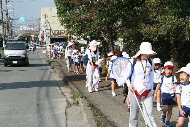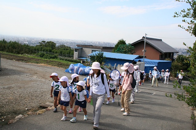 今日は少し肌寒かったですが、秋晴れのお天気の中、十三峠に行く事が出来ました。「幼稚園からず〜っと歩いていくよ!」と言っていたので、朝登園して来た子ども達は「歩けるかな〜?」と少し不安そうでした。でも、歩き出すと色々な道を通るので、楽しく歩けたようです。外環状線を越えてにわとり小屋の所で休憩でお茶とおやつのヨーグレットを食べて少しパワーアップして、山道に入りました。「先生、若草山登ったから大丈夫って言ったけど、若草山の時より坂がずーっと続いて、こっちの方がしんどいやん」とブーイングでした。こんな風に色んな話しをしながら、水呑地蔵の登山口につきました。さあ〜いよいよ自由に歩ける道です。でもここで困った問題が起こりました。ハチ(スズメバチ)がいるとの情報が入りました。だいたいハチのいる場所を教えて頂いていたので、ハヤピーが少し先に見に行って下さり、その場所は2人ずつ、そーっと通りました。それまでの山道では、サワガニと捕ったりドングリを拾ったり、みんな目を輝かせて秋の自然を楽しんでいました。半分歩いた所でカレーです。「めっちゃ、おいしい〜おなかすいたもん!」と大満足でした。あと少しで十三峠までの道は大きな石がゴロゴロ、探検隊になった気分で歩いていました。そしてトンネルをくぐると奈良!子ども達は「やったぁ!!」と喜んでいました。「もう着いたん?」とあっという間に感じていたようです。幼稚園バスが待っている所で全員でバンザ〜イ!!この時はちょっぴりホッとしたようでした。長い時間本当に良く頑張りました。誰一人「しんどい〜」と言う子がいなかったので、凄いなぁと思いました。ハヤピーが「大人になっても奈良まで歩いた!と言う事は覚えておいてね!」と声をかけて下さいました。本当にそう思います。ケガもなく全員無事に帰ってくる事ができて良かったです。林先生をはじめ付き添って下さいました先生方に、心から感謝致します。ありがとうございました。 |