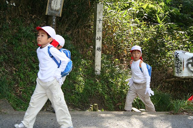 少し肌寒い中、十三峠ハイキングがありました。年長さんは誰ひとりとして「しんどい」「まだー」の声がなかったのに驚きました。天候に恵まれたのと、すずめ蜂対策で途中休息が多かったにしても、文句が出なかったのはすごい事だと思いました。蜂の巣を通る時も静かでしたし、沢ガニの川で、おしあいへしあいの満員状態の中でもお友だちを強く押したりする子はなかったように思われます。思い切りカニを捕りどんぐりを拾いとっても楽しそうでした。奈良終点でバンザイをした時は、どの子もきっと達成感を味わっていた事でしょう。ハヤピーが話されたように幼稚園の記憶は薄れ覚えていないことが多いですが、すずめ蜂の恐ろしさゆえの行動、なぜ白い服を着ていたか心の隅に残っていけばいいなぁと思います。 |