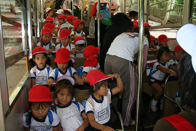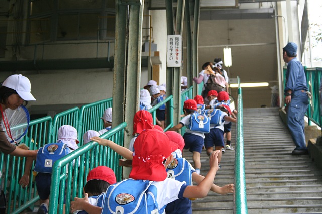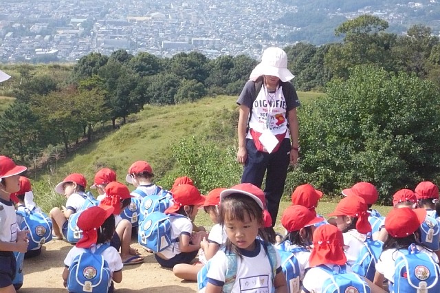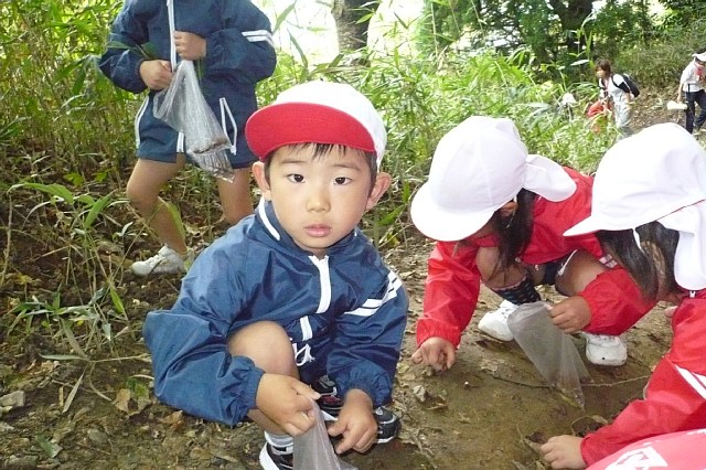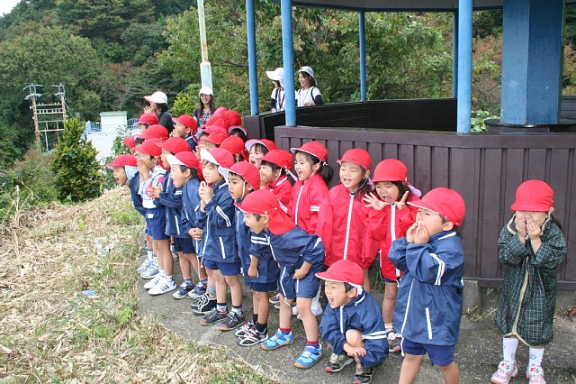 今日は年中さんのケーブルハイキングがありました。ケーブルに乗った途端にみんな喜んでキャッキャッ言っていました。他のお客さんがいてるので、静かにしなさい。小さい声でおしゃべりを。と言ってもみんな嬉しくって出来ません。初めてケーブルに乗る子ばかりで、とっても良い笑顔になっていました。上に着くとすぐに雨がパラパラ、どうなることかと思っていましたが、だんだんと雨もやみ、ドングリ拾いをする事が出来ました。沢山のドングリを拾う子、選んで拾う子といて、見ていておもしろかったです。もうおしまい!と言われてもひたすら拾ってる子もいました。今回はホイル弁当を食べられたので良かったです。遠足とは違った顔を見ることが出来ました。 |
