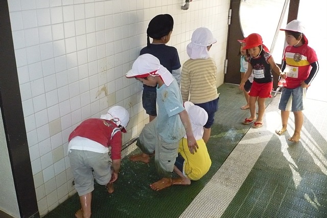 運動会後、一人ひとりが力をつけ自信につながっていますが、少しけじめがつけられなくなっています。この間も歌をうたっている時に、何人かの子がずっとふざけて笑っていて、途中でうたうのをやめて、話しをしました。「みんなの気持ちが一つになっていなくて悲しい」と伝えました。少しでも気持ちが伝わって、気がついてくれれば…と思ったからです。それから何日か過ぎた今日、とても嬉しい事がありました。運動場当番で運動場から戻ってくると全員がきちんと座って待っていてくれたのです。ちらっと、手を洗う前に、お部屋の様子をのぞいた時「先生、来た!ちゃんと座っとこう!」という声が聞こえて来たので、今日は子ども達で声を掛け合って頑張ってるなぁ〜と思い、その時あえて何も子ども達には声を掛けませんでした。そして私が「ただいま!」と入っていくとみんなにこにこ笑ってきちんと座って私の方を見ていました。子ども達の気持ちが伝わってきたので、「今日はすごいねぇ、先生びっくりしたわ〜」「うん!」「嬉しいなぁ〜」と言うと「みんなでちゃんと座って待っとこ!って決めてん」と教えてくれました。「またみんなの気持ちが一つになって、キラキラハートになったね!」と声をかけると何とも言えない笑顔でした。これからもこの気持ちを大切にいろんな事に繋げていって欲しいと思います。 |
