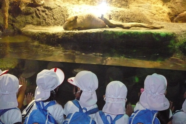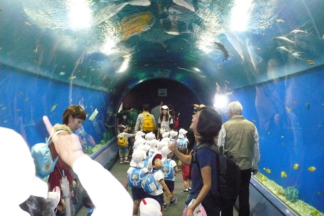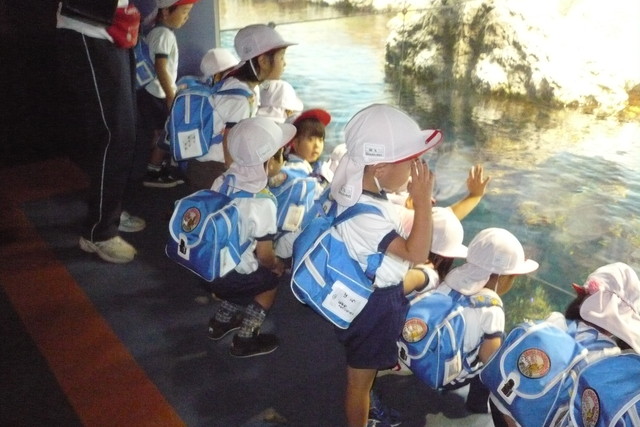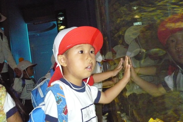 今日は、秋の遠足でした。ずっと雨の心配はされていたのですが、前日もまだ見込みがあり、当日まで大仏か、海遊館か分からない状態でした。そして今日、朝から雲行きがあやしく、奈良に雷注意報もでていたことにより、初めての海遊館へ。たくさんの団体さんが来るということで、特に年少さんは迷子にならないかだけがとても心配でした。ですが、子どもたちはとても嬉しそうで、入るなり水槽にべたーっとはりついて、目をまんまるくしていました。バスの中でみんな何を見るのが楽しみ?と聞いていたのですが、「ジンベイザメ」「ペンギン」など行った事のある子どもたちたら色々名前が出てきました。私が楽しみにしていたのは「マンボウ」ですが、子どもたちに言っても「??」という感じだったので、これは絶対に見つけなければ!でも見れるかなー?という気持ちもありました。中には他にも団体さんがいたものの、団体数も配慮されていたのでしょうが、思っていたよりゆっくりと、そして一つひとつよく見えていたので、子どもたちも大満足だったと思います。子どもたちは夢中になりながらも「ばらぐみさん行くよー」という声にはよく反応してくれ、前日から「手をはなしたら迷子さんになるから!お魚さんを見たあとは、先生がいるかどうか見てね!」とお約束していたことを守っていてくれました。心配はあったものの、こういった場所でも団体として歩いてついてきてこれるようになったことを本当にすごし成長だと感じました。春の遠足なんて真っすぐ歩く事さえままならなかった子どもたちなのに。そして私が楽しみにしていたマンボウがなんと子どもたちの目の前に!「これー!マンボウ!!」と私も興奮してしまいました。大仏さんを見る時は子どもたちは「おお―っ」と圧倒される顔でしたが、今回海遊館では「わぁー!!」と圧倒されつつも、食いつきがすごかったです。何はともあれ、子どものキラキラした表情が見れ、無事に帰ってこられれば一番です!雨や、初めての事で、保護者の方々には、長い時間待っていただき、母の会の方々もそのために色々配慮して頂きありがとうございました。 |