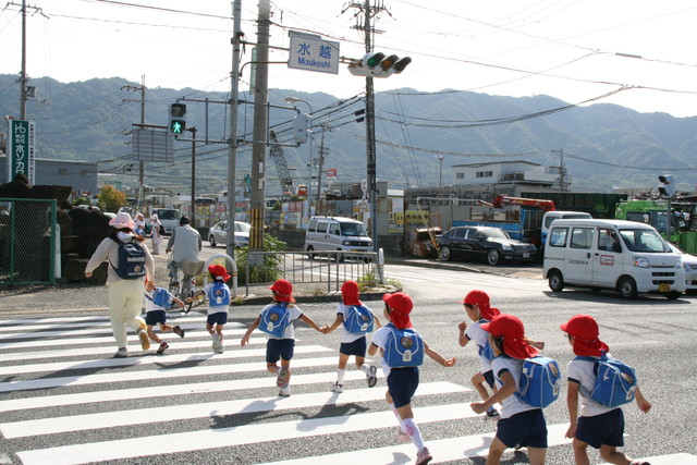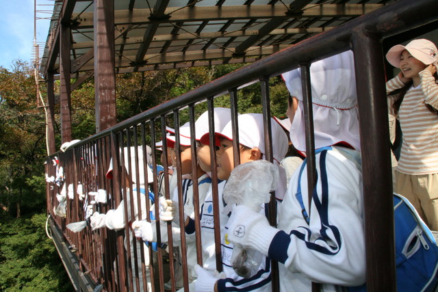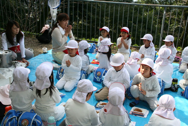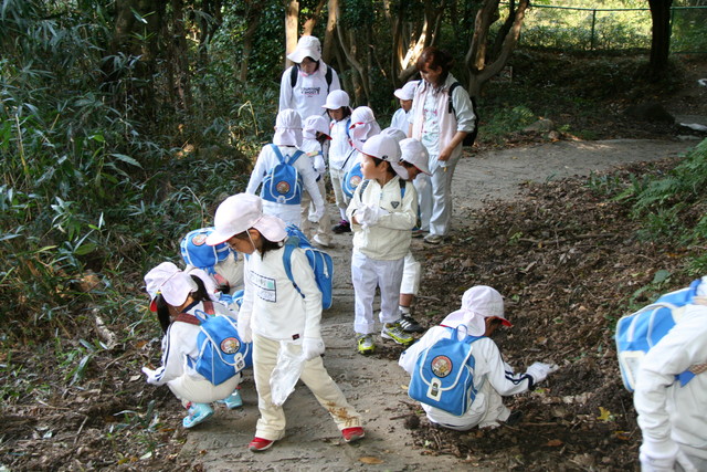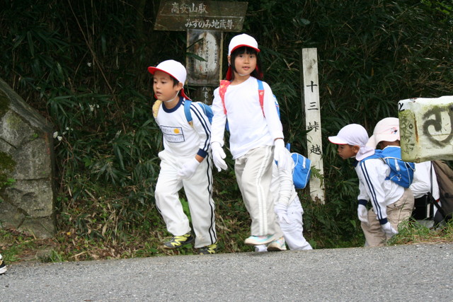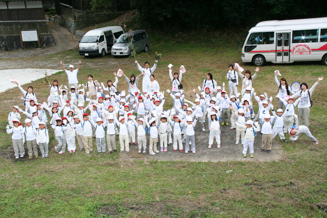 心配されていた雨も降らず、長袖を着ていると、少し汗ばむ程の天気の中、無事に十三峠ハイキングを終えることができました。朝、登園してきた子どもたちは、いつも通りホワイトボードを見ながら荷物のチェックをします。今までハイキング、遠足、何度もやってきているので、手慣れたもの。こういう時に、改めて年長らしさを感じます。準備万端で「エイエイオー!」をして出発。まずは外環より向こうのあるニワトリ小屋を目指します。自分の家の近くを通る子もいて「ここ行ったら○○のおうちや!」と張り切っていたのですが…。外環あたりに「ニワトリ小屋まだ〜!?のどかわいた〜」などの弱音がたくさん聞こえてきました。そしてやっとニワトリ小屋に着くと、そこでは“休憩”が待っていました。お茶を飲み、ラムネを食べると元気回復!とってもわかりやすい子どもたちです。そこからはひたすら坂道…。そんな中でも道端の草花や虫、後ろに見える八尾の景色をみたりと、いろんなものを見つけながら歩いていました。一人では絶対に歩けない、みんなと一緒だからこんなに楽しい発見が出来るんだろうなーと感じました。そしていよいよ山の入り口です。みんな白い服に着替え、ハチの合図もバッチリです。ハチの存在を少し怖がる子もいましたが、それぐらいの危機感を持っていないといけません。いくつかの約束を聞く事の子どもたちの表情は真剣でした。サワガニ捕りの付近や、その他もいくつかのハチポイントがありましたが、とっても良く約束を守り、気をつけて歩いてくれた子どもたちのおかげで、無事に登りきることができました。ドングリが少なく、自由に歩く事も少なかったのですが、カラスウリを見つけて喜んだり、サワガニを捕ったり、ヤッホーを言ったり、ヤクルト飲みたーいと叫んだり…子どもたちの嬉しそうな顔がたくさん見られました。やっぱり一番大喜びだったのは…カレー!「おかわり!!」のオンパレードで、まるで「早食い・大食い大会見たいやね」と先生達も笑っていました。白い服を黄色く汚して帰った子もたくさんいましたが、いい思い出といてうっすらとシミを残しておかれるのもいいかもしれませんね…。みんなで歩いた十三峠。本当にあっという間に時間が過ぎていったように感じます。付き添って頂いた先生方も「誰も嫌って言わずに、頑張ってたな〜。登りやすかったわ〜」と言ってました。最後になりましたが、子どもの帰りを首をなが〜〜くして待っておられた保護者の皆様、今回も子どもたちをベストの状態で送り出して頂き、ありがとうございました。そして、最高の笑顔で子どもたちを褒めて下さりありがとうございました。 |