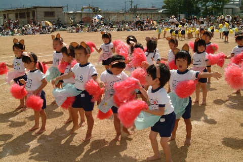 今日の広場の練習は年長さんのみで年中はお休みでした。それで日頃練習の出来ない玉入れや障害物競走の前転の練習をすることにしました。玉入れは、けっこう気分転換やストレス解消になるようですから、みんな喜んでいました。「どうやったら玉が入ると思う?!」と聞いてみるとAちゃんが「かごをよく見てねらう!」とか「少し後ろから投げるねん!」とみんなに教えてくれました。それを実行しながら、男の子対女の子ですると10対10で引き分けで、みんなでバンザイをしました。又、一度だけ年中3クラスで障害物競走の練習をした時、ゆり組はマットの所で前転をするのが下手だった様に思っていたので、今日は部屋の中にマットを持って来て、一人ずつ見てあげました。まず、手をマットにつく時足をピンと伸ばす事、足の近くに手をつく事、そしておへそを見て回る事の約束を思い出しました。運動の得意なBちゃんにお手本をしてもらい、みんなで見ました。そして順番に一人ずつしていくと…、ゆっくりすると上手にできている子が多かったです。特にアクバススポーツクラブで慣れている子はとてもきれいに回り、又、ポーズもとってくれました。みんな何度もくるん、くるんと楽しそうに回っていました。ただ本番は走っている途中で前転になるので、あわてず気を付けて回ることや、一度マットの前で止まってから回るように声をかけておきました。さぁ!当日に練習の成果が見られるでしょうか?!楽しみです。 |